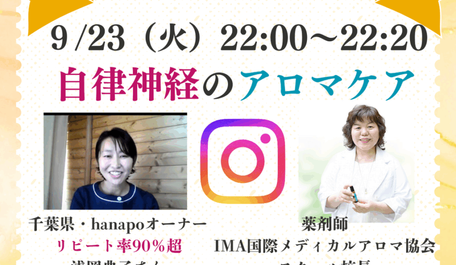 本日9/23(火)22:00~22:20 リピート率90%をキープされているhanapoオーナー浅岡典子さんとインスタライブを開催します♪テーマは「自律神経のアロマケア」25日は「更年期・不定愁訴ケア」メディカルアロマ資格取得スクール IMA国際メディカルアロマ協会